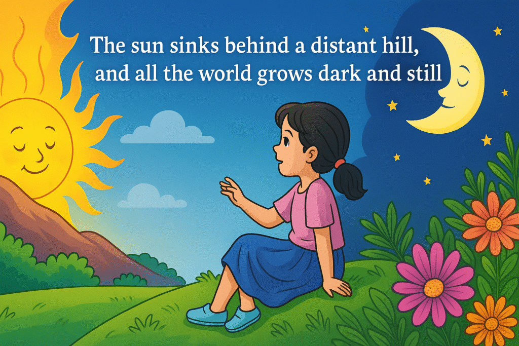 Example (Hindi): एक शाम सूरज पहाड़ी के पीछे चला गया और आकाश लाल-नारंगी हो गया। मैं उज्जवल सुबह के सपने लेकर सो गया।