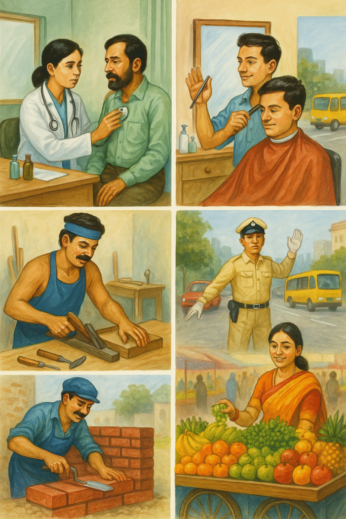 डॉक्टर बीमार लोगों का इलाज करता है, नाई हमारे बाल काटता है, ट्रैफिक पुलिसकर्मी ट्रैफिक को नियंत्रित करता है, बढ़ई लकड़ी के सामान बनाता है, मिस्त्री इमारतें बनाता है और फलवाला हमें फल बेचता है।