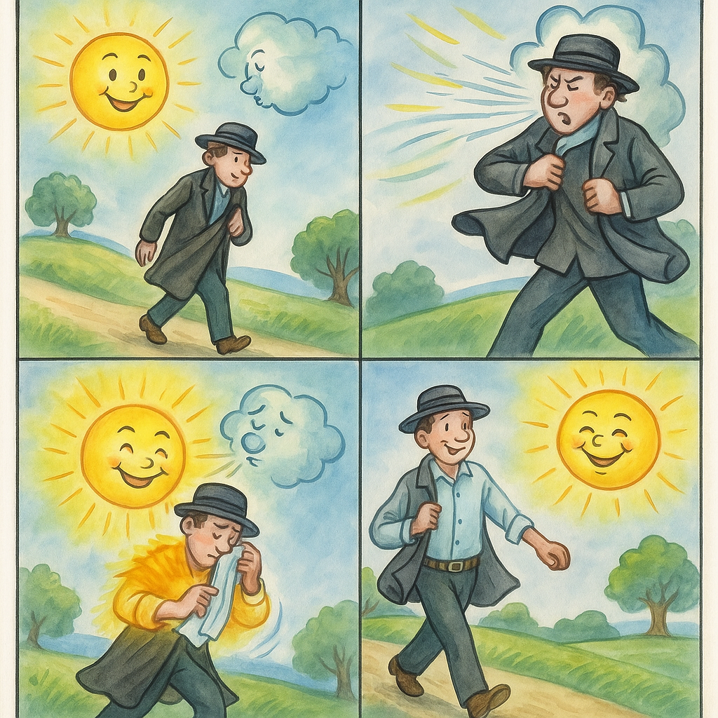 Dear wind, I have won, I have made him take off his coat.डियर विंड, आई हैव वन, आई हैव मेड हिम टेक ऑफ़ हिज़ कोटप्रिय हवा, मैंने जीत हासिल की, मैंने उसे कोट उतारने पर मजबूर किया।
