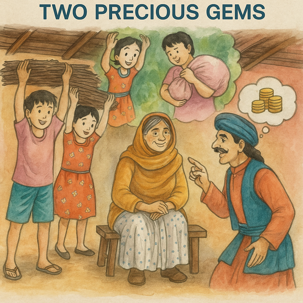 हिन्दी अर्थ: “वास्तव में, ये आपके दो छोटे अनमोल रत्न हैं”, यात्री ने अपनी आँखों में खुशी के आँसू भर कर कहा।